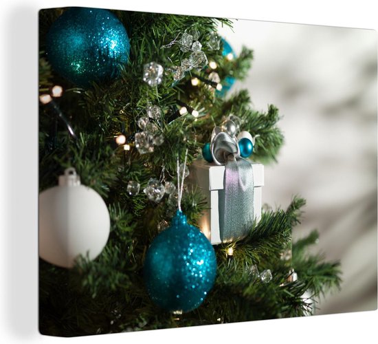 bol.com | Close-up van een kerstboom met blauw en witte kerstballen canvas 160x120 cm - Foto...